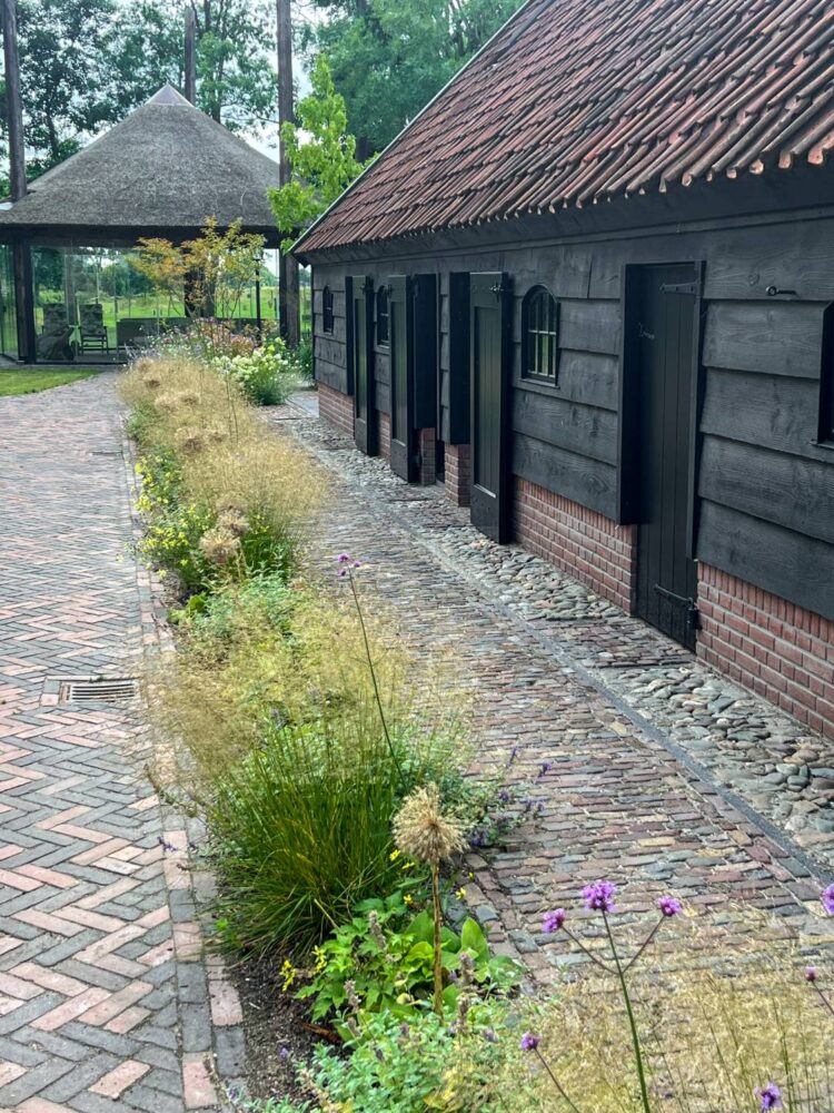 • Gebakken klinkers, houten hekken en natuursteen die het erf karakter geven